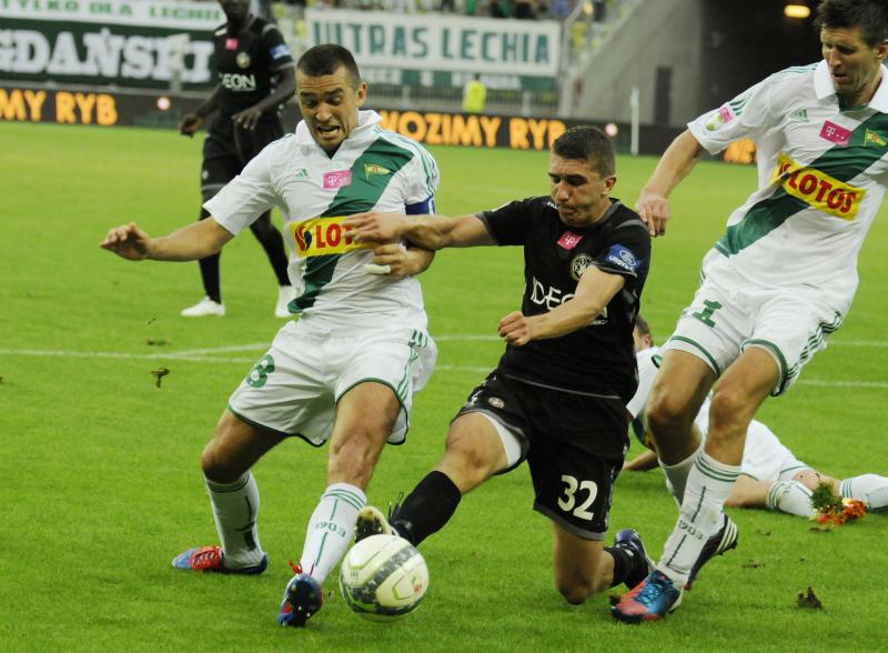 20 Sierpień 2012; Łukasz Surma, Lechia Gdańsk i Adam Pazio, Polonia Warszawa. Pierwsza kolejka T-Mobile Ekstraklasa 2012/2013 - Lechia Gdańsk v Polonia Warszawa. PGE Arena Gdańsk. Fot. Tomasz Żuber / GrFoto.org *** Local Caption *** 20 August 2012; Lukasz Surma, Lechia Gdańsk and Adam Pazio, Polonia Warszawa. T-Mobile Ekstraklasa 2012/2013, Round 1 - Lechia Gdańsk v Polonia Warszawa. PGE Arena Gdańsk. Picture credit: Tomasz Żuber / GrFoto.org